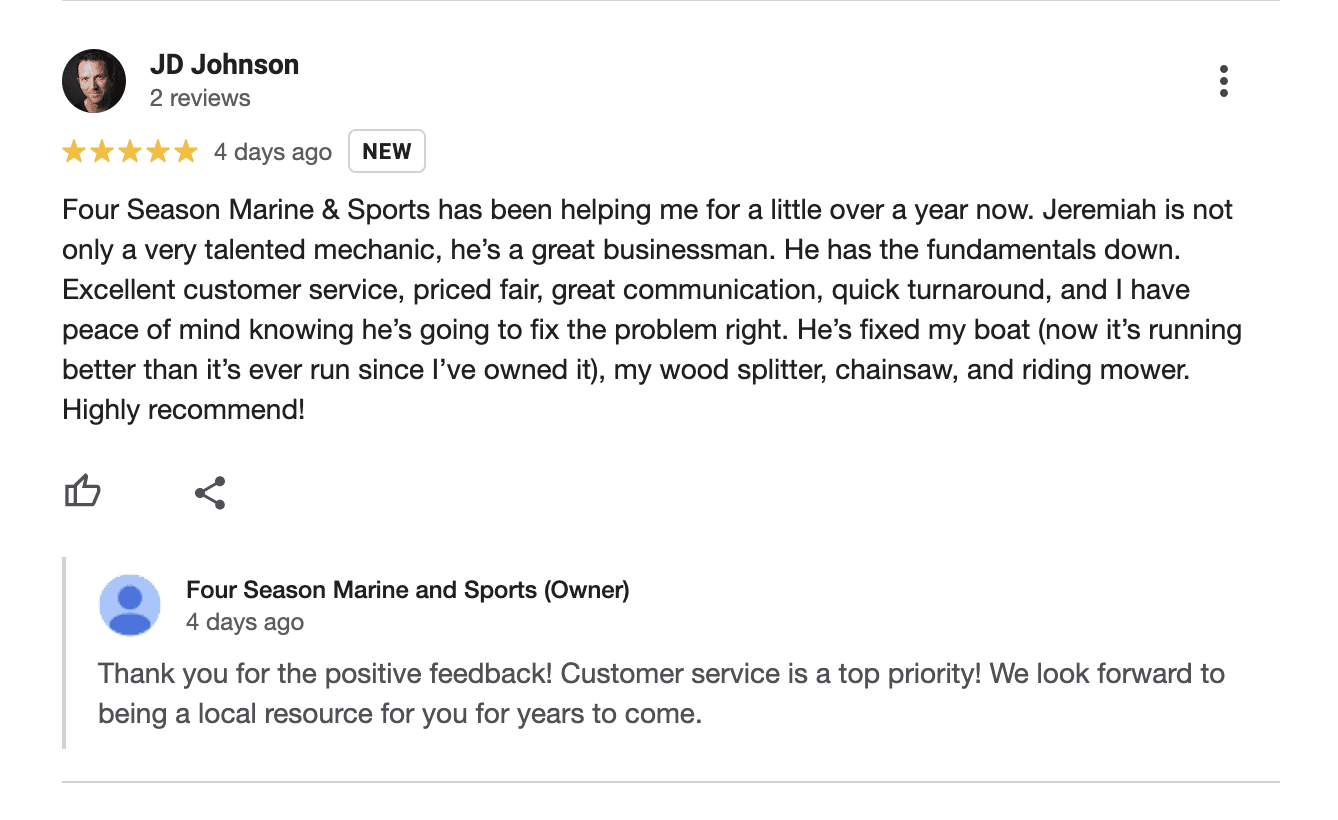 A review exchange from Four Season Marine and Sports, a client of Chase Digital Co.